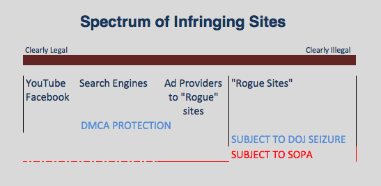 The real problem with SOPA, as far as I see it, is that it doesn’t solve a real problem. On the spectrum of infringing sites, you have sites which generate infringing content as a result of random user activity clearly protected by the DMCA, you have “rogue” sites on the other end that exploit other copyrights illegally for fun and profit, and then you have sites in the middle that profit indirectly from both sorts of sites, such as search engines and ad providers. Have a look at this handy, rather ugly chart I just whipped up: